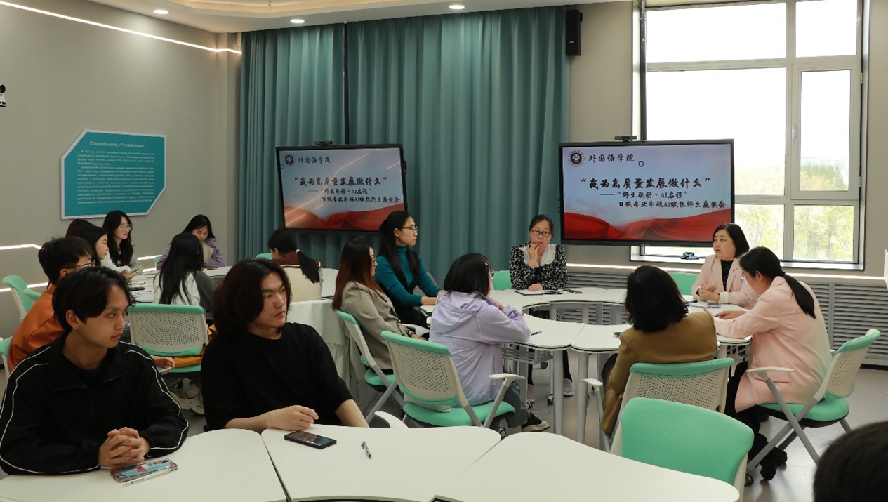 374智慧教室举行“师生联动·AI启程”日俄专业师生座谈会。座谈会由党支部书记万丽娜老师主持,部分教师党员及本硕学生代表参加,共同探讨AI赋能外语学科发展新路径。